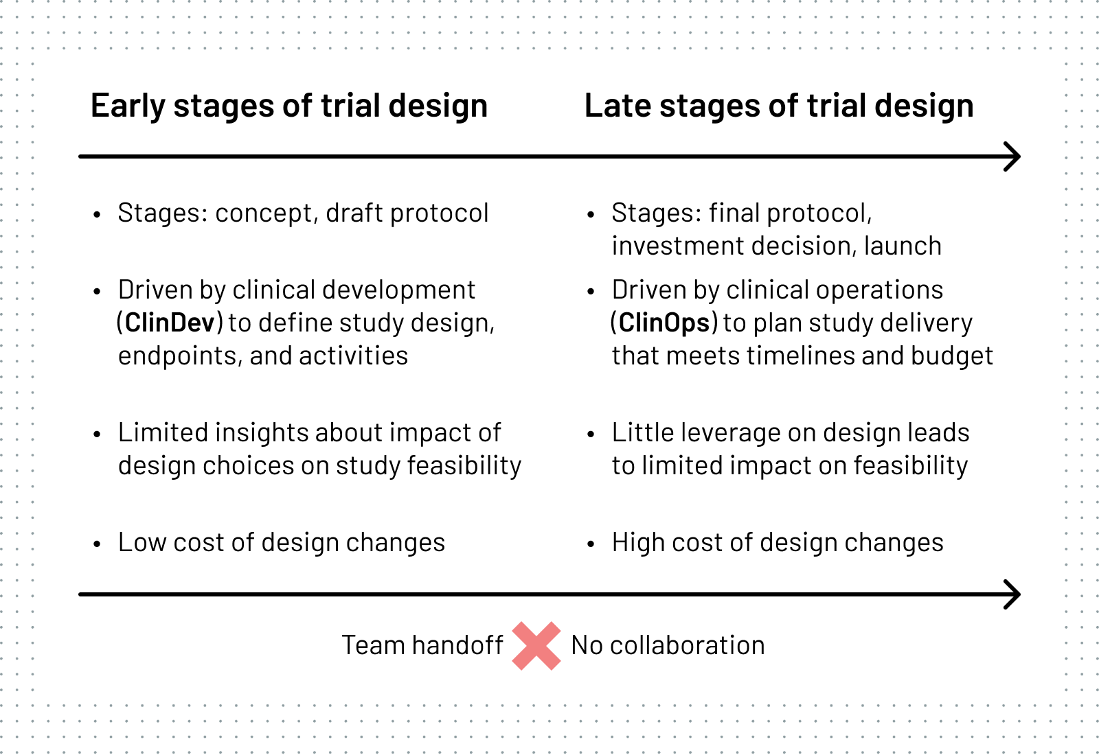The core issue is how big pharma work. Clinical Development (ClinDev) teams responsible for the science of clinical trials and Clinical Operations (ClinOps) responsible for trial delivery both rely on limited data for decision-making, and rarely collaborate during the early stages of trial creation when the cost of reducing protocol complexity and feasibility optimisation is still low.