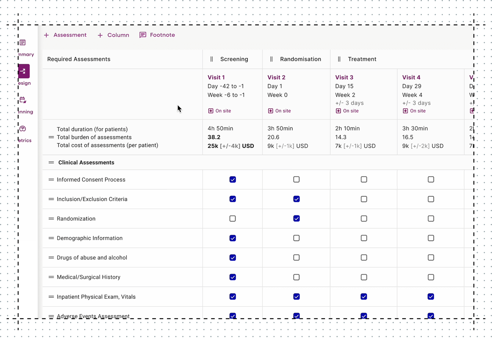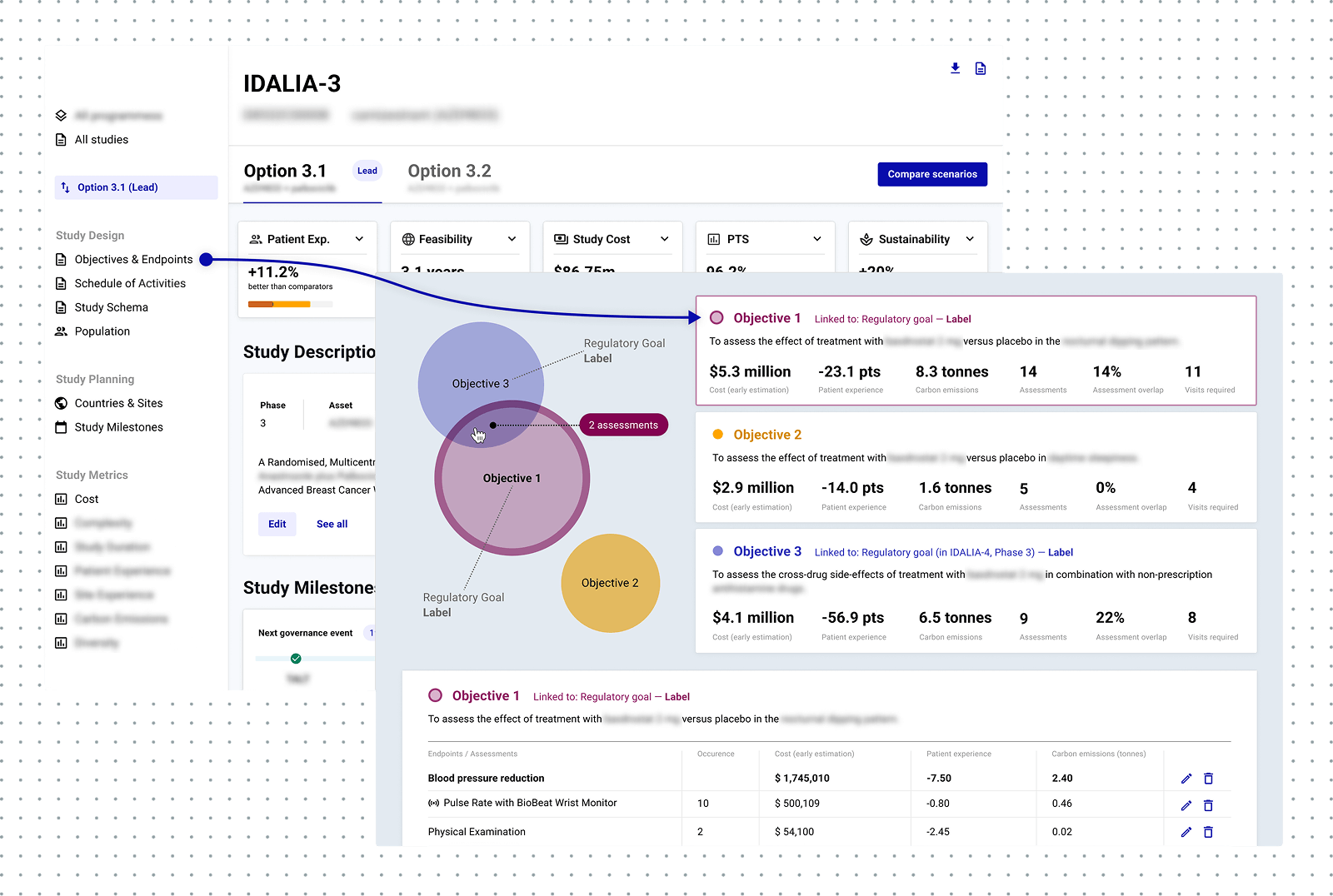 Patient experience metrics and endpoint-assessment linking help ClinDevs design patient-centric studies with only as few on-site activities as necessary, while pre-vetted templates remove the need to copy-paste. For ClinOps, real-time cost and complexity metrics help optimise trial design before changes get locked in.